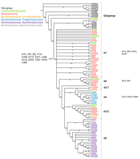 The conserved a.a. identified in the predicted sequences showed that there was common a.a. for all groups, while almost every group contained a.a. characteristic only for their group (Supplemental Table S6A–C). A comparison of phylogenetic reconstructions (Figure 2, Figure 3 and Figure 4) and these conserved a.a. positions in diatoms showed that changes occurred in the primary structure of proteins from one phylogenetic group of tubulins to another. However, there were distinctive amino acids that were not conserved. This finding clearly confirms that each of the tubulin classes had an ancestral form in which some of the positions were formed and supported by selection. Thus, for α-tubulins, these are C75, Y87, I92, T141, S168, S172, T201, L209, V212, A232, T303, V378, L388, and A400 (Supplemental File S3, Supplemental Table S6A; Figure 2). β-tubulins have 12 such positions: M139, Y167, Q198, A201, A230, A232, T236, C248, C313, S323 A351, W378 (Supplemental File S4; Supplemental Table S6B; Figure 3), while such positions have γ-tubulins nineteen, but there are too few data on this tubulin class and changes may occur with an increase in the sample (Supplemental File S5, Supplemental Table S6C; Figure 4). In all tubulin classes, the groups of pennate species, which are the youngest in the evolution of diatoms (α5, β5, β6, and γ4), have the maximum difference. In β-tubulins, of the 31 positions we identified in this work for the β1 group, 12 positions in β6 are retained in the evolutionarily subsequent groups. A.a. that were most supported by selection during the diatom evolution were indicated in phylogenetic reconstructions (Figure 2, Figure 3 and Figure 4). Since some of these a.a. occurred in evolutionarily older α1 and β1, and some, upon the emergence of subsequent groups and are supported in younger ones, we assume that they may be of functional importance and, possibly, are one of the factors influencing the species-specificity of tubulins and their role in the morphogenesis of diatoms. This conclusion is also confirmed by a division of tubulins between centric (classes Coscinodiscophyceae and Mediophyceae) and pennate (class Bacillariophyceae) diatoms.