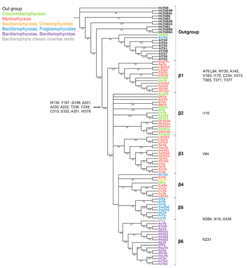 The length of predicted a.a. sequences of β-tubulins of diatoms included into our data set varies from 422 to 466 a.a. Analysis of the alignment of all sequences considered, including H. sapiens and A. thaliana (Supplemental File S4), revealed that more than 40% of a.a. positions are conserved. Differences among the β-tubulin predicted amino acid sequences of diatoms were typically found in variable positions along the entire sequence. Twelve positions are conserved for diatoms and differ from out group (see below “characteristics of diatoms”): M139, Y167, Q198, A201, A230, A232, T236, C248, C313, S323, A351, and W378 (Supplemental File S4; Supplemental Table S6B; Figure 3).