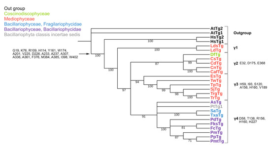 The γ-tubulins were separated into four groups (γ1–γ4) (Figure 4). The γ2–γ4 groups were also formed as a result of polytomy. The γ1 group was formed by two centric diatom species from the class Mediophyceae. The γ2 group included the centric diatoms from the family Chaetocerotaceae (class Mediophyceae) and a single Coscinodiscophyceae species, Dactyliosolen fragillisimus. The γ3 group contained centric diatoms from the class Mediophyceae, and pennate diatoms (class Bacillariophyceae) formed the γ4 group.