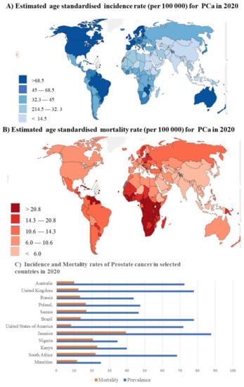GLOBOCAN incidence and mortality statistics for Prostate cancer: (A) world map representing the worldwide age standardized incidence rates of prostate cancer. The highest rates are observed to be in North America, the Caribbean, Western Europe, Brazil, Australia and New Zealand; (B) world map representing the worldwide age standardized mortality rates of prostate cancer. The highest mortality rates are in Sub-Saharan Africa; (C) a graph comparing the incidence and mortality rates of specific countries demonstrating various trends. All data fall within the 95% confidence interval [28].