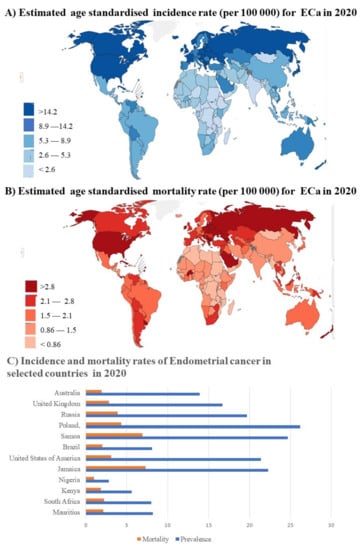 GLOBOCAN incidence and mortality statistics for Endometrial cancer: (A) world map representing the worldwide age standardized incidence rates of endometrial cancer. The highest rates are observed to be in North America, Eurasia, Australia and New Zealand; (B) world map representing the worldwide age standardized mortality rates of endometrial cancer. The highest mortality rates are in North America and Eurasia, mirroring the incidence rates and Australia and New Zealand; (C) a graph comparing the incidence and mortality rates of endometrial cancers in specific countries demonstrating various trends. All data fall within the 95% confidence interval [28].