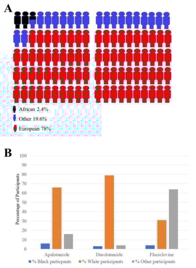 Therapeutic clinical trials for men with PCa have considerably increased over the past 16 years [39]. However, one of the obstacles impeding significant progress is the lack of adequate representation of other populations such as those of African ancestry in general medical research (Figure 3A). In a recent paper describing the methods of representing genome wide association study (GWAS) data, a summary of the race of the participants in these studies showed the racial disparities in these recent GWAS. This showed an obvious bias towards white or European populations in these studies. This is represented in Figure 3A. In addition to this, the enrolment of participants in the clinical trials for three FDA approved drugs specifically for PCa treatment is shown in (Figure 3B). The data in Figure 3B show the percentage of each racial group enrolled in these clinical trials. For instance, PCa-centered studies in the USA have revealed the unwillingness of African American men to partake in such clinical research given the opportunity. Concerns over transparency and relevance to cultural contexts need to be considered for adequate inclusion [40].