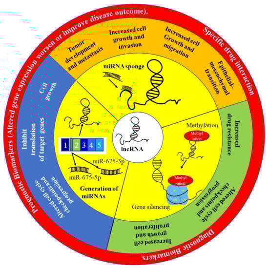 The role of lncRNA in precision oncology. The lncRNA H19 has been implicated as playing an important role in the development and progression of many cancers, including PCa. This lncRNA is able to act by preventing many miRNAs from performing their function by acting like a sponge and binding to these miRNAs preventing them from targeting MRNAs. The H19 gene is also spliced to generate miRNAs such as miR-675-3p and miR-675-5p. Finally, H19 can silence gene expression through methylation of histones.
