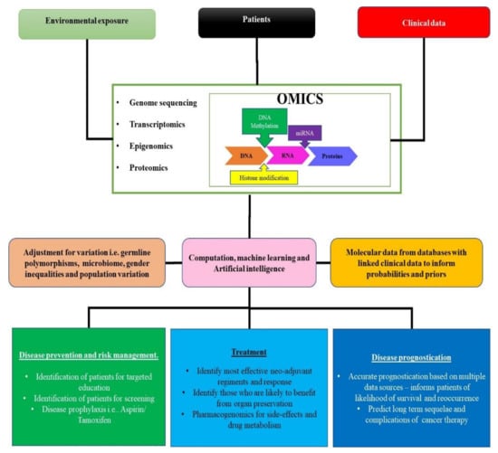 Sir William Osler (1849–1919) famously stated that no two persons can react alike to disease [1]. Precision oncology is derived from precision medicine, a form of medicine where information about an individuals’ genetic make-up is used to personalise or tailor medical care specifically for the individual. This can include the use of protein or RNA biomarkers for disease prevention, early diagnosis, improved prognosis and treatment. For this reason, precision medicine is also known as personalized medicine. The application of precision medicine in cancer has proved to be a popular research goal and led to the adoption of the term precision oncology [2,3]. The customization of therapeutic regimens to each patient is important because of the unpredictable effects induced by therapeutic drugs that can vary from one person to another according to their own genetics, phenotypic, or psychosocial characteristics [4]. For example, the HIV drug abacavir and the antiseizure drug carbamazepine should not be prescribed to patients who carry the HLA-B*5701 or HLA-B*1502 genotype to avoid serious side effects [5]. As such, precision medicine enables health care workers to make data-driven decisions. For example, specific target genes that increase a patient’s risk of developing a certain cancer can assist in early diagnosis, while those genotypes that predict better or worse outcomes can improve prognosis and, finally, transcriptomic changes can predict the therapeutic effects of drugs for each patient [5]. Pharmacogenomics is the cornerstone of precision medicine and is a research field concerned with how a person’s unique genome affects their response to drugs [6]. It has been reported that, after heart failure and cancer, medical error is the third leading cause of mortality in the USA., with 180,000 to 251,000 medical error-related deaths annually [7,8]. Factors contributing to this devastating number include misdiagnosis, medical system communication breakdown, growing cost and poorly coordinated care. In combating these devastating effects, precision medicine is evolving as a promising innovative pillar for transforming health care and improving overall patient outcome [9,10]. Precision medicine integrates multi-omics profiles with demographic and epidemiological data as well as clinical and imaging data. Not only does this multifaceted integration allow for the aforementioned improvement in early diagnosis, prognosis and treatment, but it also allows for lower cost treatment and disease management. Furthermore, the efficiency of this integration primarily depends on the 4Ps: Predictive, Preventative, Personalised and Participatory treatment for each individual patient [11]. Advances in precision medicine are being actively pursued, despite various challenges such as ethical and social issues and the protection and privacy of patients’ omics data [12].