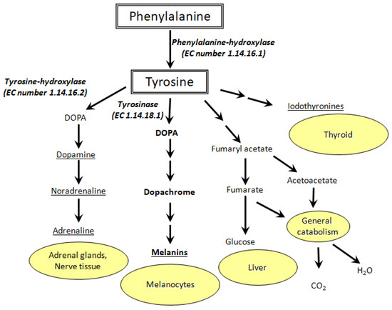 - Chakrapani, A.; Gissen, P.; McKiernan, P. Disorders of Tyrosine Metabolism BT. In Inborn Metabolic Diseases: Diagnosis and Treatment; Saudubray, J.-M., van den Berghe, G., Walter, J.H., Eds.; Springer: Berlin/Heidelberg, Germany, 2012; pp. 265–276. ISBN 978-3-642-15720-2. [Google Scholar]