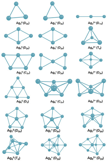 Ag3q (q = 0, +1, +2) clusters have two types of geometry: linear (D∞h symmetry) and triangular (D3h). The triangle is the most stable system for q = 0–1, whereas the linear structure is the most energetically favorable for q = +2 (Figure 2). Two bonds of the Ag30 NC are 2.67 Å, whereas the third bond equals 2.96 Å. Each bond of the Ag3+ cluster is 2.7 Å. Ag32+ possesses bond lengths equal to 2.84 Å. It should be mentioned that the Ag–Ag bond distance increases with the growth of cluster charge, which is observed for all the clusters with n = 2–8.