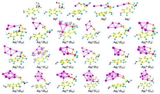 The established complexes of Agnq (n = 1–8, q = 0–2) NCs and Tyr−1 (PBE-D3 optimization); the point group of a cluster is written in brackets.