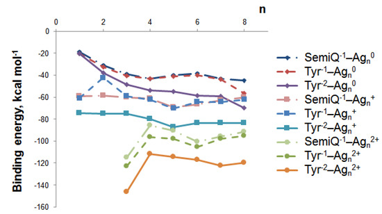 We have performed calculations for the Tyr complexes with silver NCs Agnq (n = 1–8, q = 0–2). Previously, we have shown that silver NCs are most effectively synthesized on tyrosine in an aqueous solution at pH 12.5 [33], which means that the synthesis occurs with the participation of twice deprotonated tyrosine Tyr−2. It is also known that tyrosine can reduce Ag+, forming a semiquinone (SemiQ) [32]. In this regard, the calculations have been done for three forms of tyrosine: Tyr−1, Tyr−2, and SemiQ. At an alkaline pH, SemiQ is singly deprotonated; for this reason, we have performed calculations for SemiQ−1.