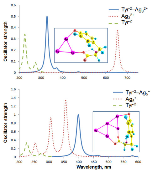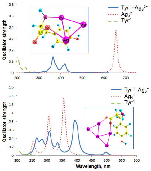 Absorption spectra of the Tyr−1 complexes with Ag nanoclusters according to the TDDFT M062X/def2-TZVP method. Lorentzian broadening with a bandwidth at ½ of the height (FWHM) equal to 15 nm has been used. Geometry of the complexes is presented in the insets.