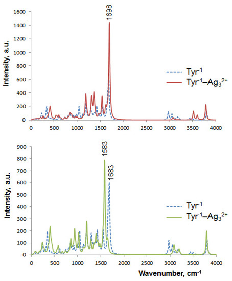 Vibrational and Raman spectra of the Tyr–Ag complexes and the isolated Tyr have been obtained using DFT: the B3LYP functional with D3 dispersion correction, the 6-31G(d,p) basis set, LANLTZ ECP, and the COSMO model for water. The B3LYP shows good accuracy in predicting vibrational [52] and Raman [53,54] spectra as compared to other DFT functionals and even the MP2 method. The natural bond orbital (NBO) analysis has been done using the B3LYP in Gaussian 16 [55].
