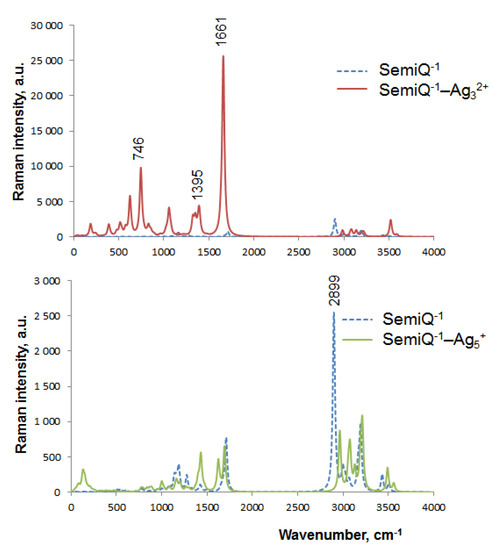 The natural bond orbital theory allows one to analyze the main transitions of the SERS spectra in terms of the metal–ligand ground state charge transfer (CT). Thus, the CTs between Ag and the functional groups of SemiQ−1 determine the emergence of a band at 1661 cm−1 in the spectrum of the SemiQ−1–Ag32+ complex.