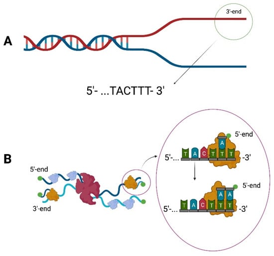 DNA polymerases require a free hydroxyl group at the 3′-end to catalyze DNA replication. Typically, it is provided by the activity of a primase, which synthesizes a short stretch of RNA on template DNA. However, the initiation of replication of bacteriophage ϕ29 does not require the presence of RNA polymerase. The bacteriophage ϕ29 has a genome in the form of double-stranded linear DNA. During infection, once the genetic material enters the host cell, the initiation of replication takes place through the p3 terminal protein covalently linked to the 5′-end of the DNA. Then the DNA ends are destabilized due to the interaction with the p6 protein [22,23,24]. It also turned out that the last and penultimate nucleotides in the genome of bacteriophage ϕ29 are TT (Figure 1A).