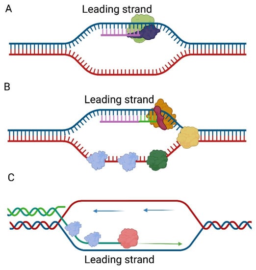 - Benkovic, S.J.; Valentine, A.M.; Salinas, F. Replisome-mediated DNA replication. Annu. Rev. Biochem. 2001, 70, 181–208. [Google Scholar] [CrossRef] [PubMed]