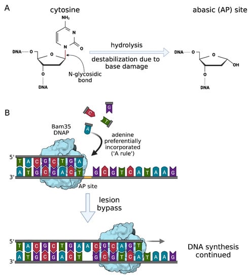 Abasic site bypass via the A-rule and translesion synthesis by Bam35 DNA polymerase. (A) Abasic AP sites form after the cleavage of the N-glycosidic bond between nitrogenous base and deoxyribose sugar, whereas the phosphodiester backbone of DNA remains intact. Base loss may occur due to spontaneous or enzymatic hydrolysis as well as base damage leading to destabilization of N-glycosidic bond (adapted from [46], with modifications). (B) Translesion synthesis by Bam35 DNA polymerase. Once encountering an abasic site, Bam35DNAP (light blue) incorporates dATP opposite the lesion, passes through it and continues DNA synthesis in a faithful manner [47].