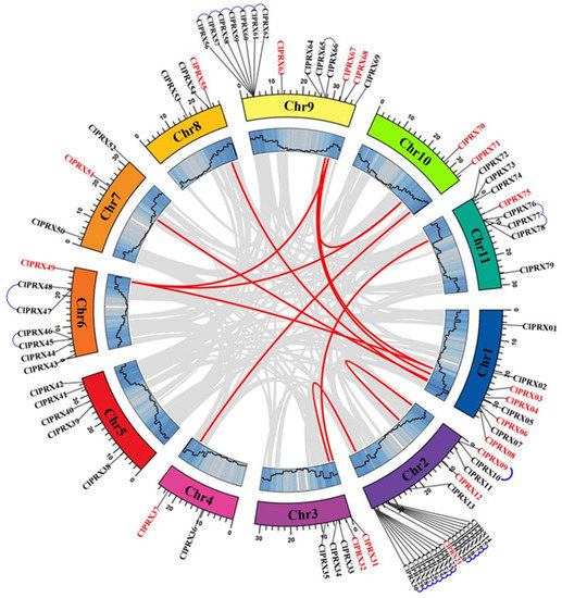 A Circos diagram of ClPRXs’ localization on each chromosome and their linear relationship between genes. Fragment replication of gene pairs is linked by red lines and tandem replication of gene pairs by blue lines.