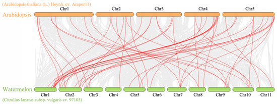The collinearity analysis results between watermelon and Arabidopsis revealed 13,489 collinearity gene pairs between the two species (Figure 2), among which 35 PRX genes of Arabidopsis and 28 ClPRXs constituted 47 collinearity gene pairs (Table S4). The colinear gene pairs of ClPRXs reached a maximum (11 pairs) on Chr01. The number of gene pairs on Chr02, Chr09, Chr10, Chr05, Chr07, Chr03, Chr08, Chr06, Chr011, and Chr04 decreased sequentially, but Chr04 had at least one gene pair. These genes showed high similarity with the same function and might originate from a common ancestor. In addition, we found that Arabidopsis PRX genes can map 1–4 ClPRX homologous genes, indicating that ClPRXs may have fourfold replication in the evolutionary process [22]. After the Ka and Ks value calculations, thirteen pairs of collinear peroxidase genes of watermelon and Arabidopsis with a Ks value of zero were found. Synonymous mutations had occurred and could be synonymous mutations. The remaining genes for Ka/Ks had a value less than one, which showed more conservative results for the ClPRXs in the interspecific evolution method for the purification of choice. The gene pairs with a stable structure and collinearity between species were also more consistent in function.