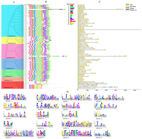The constructed phylogenetic tree of ClPRXs showed division into seven groups (Figure 3A). The number of genes in group I was the largest (30 counts), followed by group III (14 counts), group IV (10 counts), groups II, V, and VII (7 counts), group VI (4 counts), and finally, group IV (4 counts). The gene structure, amino acid ratio, conserved motif elements, and functional domain similarity of the genes were higher in the group. The gene exon–intron structure is an important feature of gene evolution, but the exon structure is a significant part of the coding protein. The insertion of introns or structural loss in the process of exon evolution might lead to positive selection, functional loss, or mutation in gene evolution. There were significant differences in the number of exons in ClPRXs, as shown in Figure 3C. The number of exons in 79 ClPRXs ranged from one to fourteen, among which sixty-nine genes had three and four exons and were the most common genes. The structure of the four genes in group VI was relatively stable, with only one to two exons, and three of them had no intrusions. The seven genes in group VII showed the most complex genetic structure, with a maximum of fourteen exon counts in ClPRX32 gene members and the fewest exons with nine counts in ClPRX21.