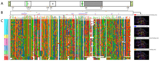 To display the clear protein structural characteristics of ClPRXs, we combined amino acid comparative, protein structural characteristic, and protein functional domain binding site analyses. In accordance with previous studies, we found that ClPRXs had three highly conserved protein domains (I, II, and II, as shown in Figure 4A), which were the distal-heme-binding domain, position domain, and proximal-heme-binding domain, and these domains also corresponded to the conserved protein motifs Motif 1, Motif 2, and Motif 3 in Figure 3D, respectively. From the comparison of the protein sequences of ClPRXs in Figure 4C, the region after the conserved domain of III demonstrated a large difference due to the peroxidase characteristics in the multifunction catalysis. This region might be the catalytic domain specific to the peroxidase (shown as the gray area in Figure 4A). Peroxidase has four main conserved functions, and each functional site is marked in different colors, as shown in Figure 4B. The heme-binding site mainly consists of distal histidine (Hd) and proximal histidine (HP), and the proximal histidine (HP) can connect one Fe element. In addition, the active site, substrate-binding site, and Ca-binding site are responsible for connecting two calcium elements.