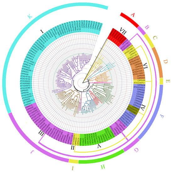 The phylogenetic tree of all genes was constructed and analyzed between the watermelon and Arabidopsis PRX families (Figure 5), and the tree results were mainly divided into seven large groups and eleven subclasses. According to the results of the evolutionary tree analysis, the PRX gene families of watermelon and Arabidopsis could be classified into 11 subclasses (A, B, C, D, E, F, G, H, I, J, K) to better display the evolutionary and functional relationships between watermelon and Arabidopsis PRX genes. According to the internal evolutionary relationship of ClPRXs, we divided them into seven groups (Figure 3A). When constructing the evolutionary tree with the Arabidopsis PRX gene family, we found that genes of group II and III ClPRX members had evolutionary relationship changes and showed a scattered distribution. Group II was divided into three subclasses (C, E, and I), and group III was divided into three subclasses (B, G, and J). All seven groups are indicated in Figure 5.