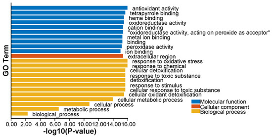 Gene Ontology (GO) enrichment analysis of all ClPRXs (Figure 6) showed that the cellular component was mainly the extracellular region, accounting for 71 out of 79. ClPRX07, ClPRX10, ClPRX11, ClPRX21, ClPRX32, ClPRX53, ClPRX54, and ClPRX79 were not enriched. All the PRX genes of watermelon were enriched in the GO function of binding in the biological process. The main enriched functions were functional antioxidant activity, tetrapyrrole binding, heme binding, oxidoreductase activity, and oxidoreductase activity, with peroxide acceptor activity accounting for 78 out of 79 total functions, and neither ClPRX32 was enriched. The next most enriched functions were ion binding (total of 73 out of 79), cation binding, and metal ion binding (total of 72 out of 79). Among the molecular functions, all the PRX genes of watermelon were enriched in response to stimulus, cellular process, and biological process. Seven functions were prominently enriched: response to oxidative stress, response to chemicals, cellular detoxification, response to toxic substances, detoxification, cellular response to toxic substances. Cellular oxidant detoxification accounted for 78 out of 79 functions, while ClPRX32 was not detected at all. Cellular metabolic processes and metabolic processes accounted for 74 out of 79 functions. The specific PRX gene GO enrichment information is provided in Table S6.