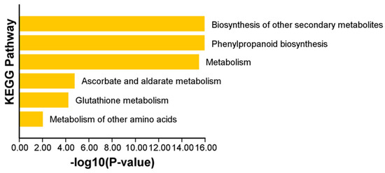 Kyoto Encyclopedia of Genes and Genomes (KEGG) enrichment analysis showed that only seventy-five genes out of the seventy-nine ClPRXs were hits, and the main class was involved in six metabolic pathways (Figure 7): the biosynthesis of other secondary metabolites. The phenylpropanoid biosynthesis pathway accounted for 68 out of 75 metabolites: seventy-four metabolites participated in the metabolic pathway, and six out of seventy-five were mainly involved in metabolism, ascorbate and aldarate metabolism, glutathione metabolism, and the metabolism of other amino acids. The subsequent main classes, A09130 Environmental Information Processing, A09150 Organismal Systems, A09180 Brite Hierarchies, A09130 Environmental Information Processing, and A09180 Brite Hierarchies were removed because of a p-value > 0.05. According to the KEGG enrichment analysis of seventy-nine ClPRXs, four (ClPRX16, ClPRX42, ClPRX56, and ClPRX61) were not involved in any pathway. The KEGG enrichment information for the specific PRX gene families is shown in the attached Table S7.