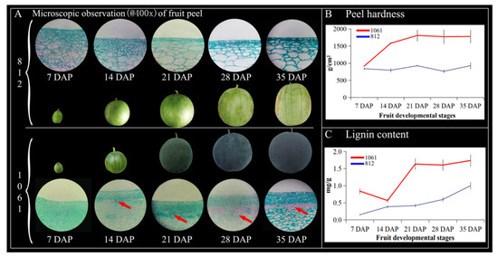 There were significant differences in peel structure development, peel hardness, and lignin content accumulation in crack resistance at different developmental stages of two watermelon materials. There was also a noteworthy correlation among peel hardness, structure, and endogenous lignin contents (Figure 10). The peel microstructure analysis of crack-susceptible watermelon “812” displayed no presence of the stone cell structure, while the peel of material “1061” was crack-resistant because there was the presence of a cell structure, which began to develop at 14 DAP (Figure 10A). We also noticed that peel hardness (g/cm2) of crack-susceptible watermelon “812” did not change relatively (838.87 ± 31.38, 794.43 ± 61.37, 924.80 ± 11.05, 763.57 ± 48.21, 927.17 ± 98.70), but the peel hardness of crack-resistant material “1061” (912.83 ± 10.41, 1580.47 ± 27.14, 1807.73 ± 163.51, 1771.67 ± 206.01, 1778.17 ± 192.75) changed steadily due to the development of the cellular structure and lignification accumulation, which exhibited a clear correlation with peel hardness at three key periods of 14 DAP, 21 DAP, and 28 DAP (Figure 10B), but hardness seemed to be stable until 35 DAP.