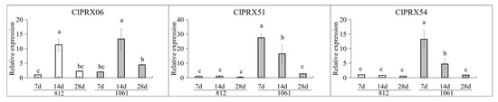 Expression levels of candidate ClPRXs in different developmental stages of peel. The values represent the means ± SDs, and different bars indicate significant differences (p < 0.05) of genes’ expression level. Statistical letters (a, b, c, and bc) indicate the significant differences of relative expression of genes in “812” and “1061” watermelon materials.