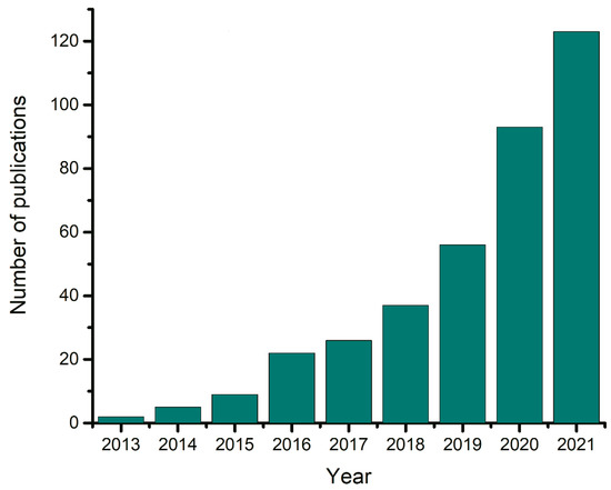 One of the proven approaches to targeted material development is combined experimental and theoretical research [21,22]. Theory is used to determine the relationship between the structure and properties and can serve as a guide for further experiments. Computer simulations have their own methodological and practical issues, but they are unique in that they allow for direct observations of intermolecular interactions and processes at the nanoscale [23,24]. According to Web of Science, the number of studies devoted to computer simulations of DESs has been increasing exponentially since 2013 (Figure 1). In addition, the development of artificial intelligence (AI)-based approaches offers a new way to establish links between the structure and material properties.
