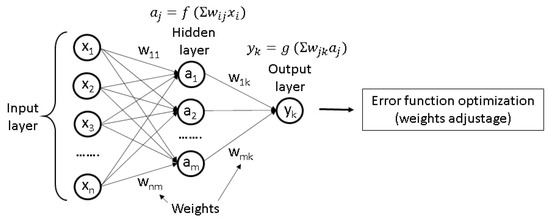 After a translation of the structure to a set of its features has been performed, it can be regarded as an input layer of an ANN. The next step is transferring the initial data from one layer to another by applying a transformation function to the input data using appropriate weights at each node. The final layer consists of nodes that represent the properties of interest, for example, density or viscosity. As a result, the model can recognize some unknown non-linear correlations between the different features of the investigated material, although it does not explain the reasons for the existence of such correlations. In most cases, the ANN can be taught using training datasets, containing structures with already known properties. This training involves minimization of an error function and adjusting the weights [182]. A scheme of a simple commonly used model of ANN called “multilayer perceptron” is presented in Figure 2.