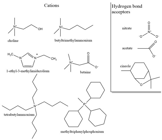 In this section, we summarize the structural characteristics of different DESs obtained by different simulation methods. Most of the work has been devoted to the third type of DES (see Table 1 in Introduction). It consists of a HBD and an organic salt. To control the structure and properties of DES, each component can be varied. We first overview the role of each component in DES structure formation based on existing simulation studies. Figure 3 and Figure 4 illustrate the chemical structures discussed in this section.