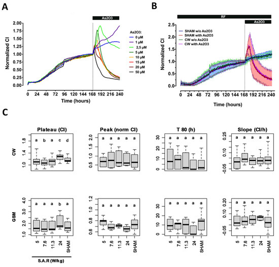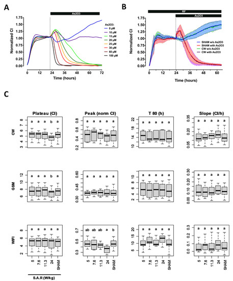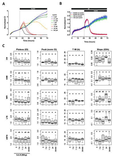 2.2. Effect of RF Exposure on SH-SY5Y Cell Behavior Assessed by Impedancemetry in the Presence or Absence of As2O3 Co-Exposure