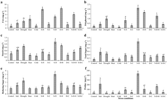 Biochemical status of plants under different stress conditions. Estimation of (a) free amino acids, (b) polyphenols, (c) starch, (d) total sugars, (e) reducing sugars, and (f) proline in peanut under individual and combined stresses (S-D: salinity and drought, S-H: salinity and heat, S-C: salinity and cold, D-H: drought and heat, D-C: drought and cold, S-D-H: salinity, drought, and heat, and S-D-C: salinity, drought, and cold). The data are the mean ± SE; different letters indicate significant differences at p < 0.05.