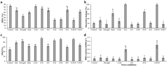 Physiological status of plants under different stress conditions. The estimation of (a) relative water content (RWC), (b) electrolyte leakage, (c) membrane stability index (MSI), and (d) lipid peroxidation (MDA content) in peanut plants under different individual and combined stresses (S-D: salinity and drought, S-H: salinity and heat, S-C: salinity and cold, D-H: drought and heat, D-C: drought and cold, S-D-H: salinity, drought, and heat, and S-D-C: salinity, drought, and cold). The data are the mean ± SE; different letters indicate significant differences at p < 0.05.