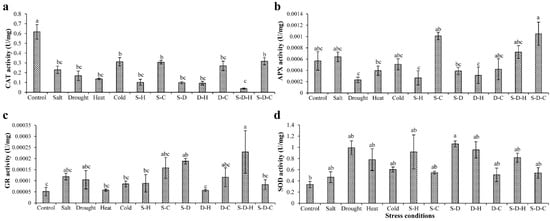Antioxidant enzyme assays. The estimation of (a) catalase (CAT), (b) ascorbate peroxidase (APX), (c) glutathione reductase (GR), and (d) superoxide dismutase (SOD) activities in peanut plants under different individual and combined stresses (S-D: salinity and drought, S-H: salinity and heat, S-C: salinity and cold, D-H: drought and heat, D-C: drought and cold, S-D-H: salinity, drought, and heat, and S-D-C: salinity, drought, and cold). The data are the mean ± SE; different letters indicate significant differences at p < 0.05.