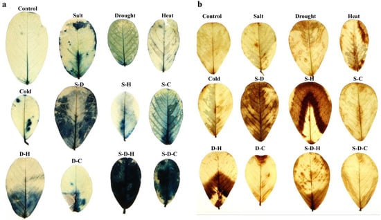 Qualitative histochemical assay of peanut leaves. (a) NBT assay for identifying the accumulation of free oxygen radicals, and (b) DAB assay for identifying the accumulation of H2O2 in peanut leaves under different individual and combined stresses (S-D: salinity and drought, S-H: salinity and heat, S-C: salinity and cold, D-H: drought and heat, D-C: drought and cold, S-D-H: salinity, drought, and heat, and S-D-C: salinity, drought, and cold).