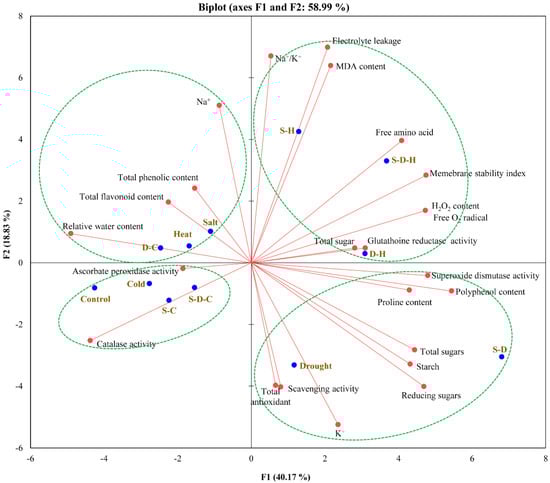 Correlation analysis (PCA biplot) between the different individual and combined abiotic stresses and physio-biochemical parameters in peanut plants (S-D: salinity and drought, S-H: salinity and heat, S-C: salinity and cold, D-H: drought and heat, D-C: drought and cold, S-D-H: salinity, drought, and heat, and S-D-C: salinity, drought, and cold).