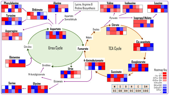 The differential accumulation of metabolites that are involved in the TCA and urea cycles and various amino acid biosynthesis pathways in peanut plants under different abiotic stresses (M: no stress, S: salinity, D: drought, H: heat, C: cold, S-D: salinity and drought, S-H: salinity and heat, S-C: salinity and cold, D-H: drought and heat, D-C: drought and cold, S-D-H: salinity, drought, and heat, S-D-C: salinity, drought, and cold).