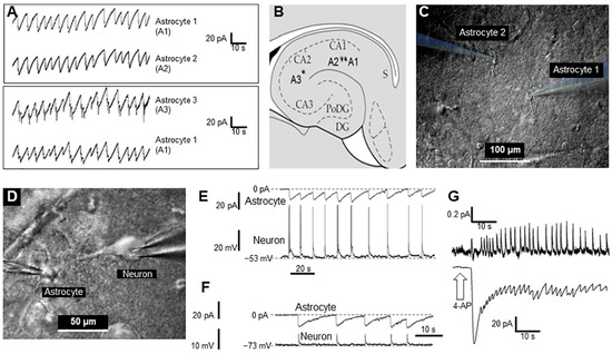 Synchronous activity of two astrocytes and neurons in the CA1 zone of the rat hippocampus after short-term application of 2 mM 4-AP: (A). Currents recorded from hippocampal astrocytes 1 and 2 (top panel) and 1 and 3 (bottom panel). (B). Sketch of the hippocampus with schematic positions of the astrocytes that were monitored in pairs. (C). Infrared image of two astrocytes with electrodes for patch-clamp. (D). Infrared image of a neuron and an astrocyte with electrodes attached for patch-clamp. (E,F). Current and voltage recording from an astrocyte and neuron, respectively. Panel E shows the neuron action potentials (APs), and the synchronous changes in the astrocyte’s membrane potential (Panel F) shows the excitatory postsynaptic potentials (EPSPs) of the neuron, observed during artificial hyperpolarization of the neuron, and synchronous changes in the membrane potential of an astrocyte. (G). Extracellular recording of neuron firing and current changes recorded from an astrocyte (top and bottom, respectively) elicited by 4-AP.