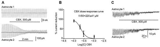 We also used different concentrations of CBX and paired recordings in astrocytes to build a dose–response curve (Figure 2B), showing that 220 ± 41 µM (n = 60) CBX applied to the slice reduced the number of functional GJs by half.