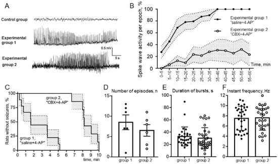 The animals were divided into control (n = 4) and two experimental groups (Figure 5D): group 1 (“saline + 4-AP”, n = 6) and group 2 (“CBX + 4-AP”, n = 6). The rats of the control group received intracortical administration of saline (0.9% NaCl) or CBX (50 mM, 4 µL, Sigma-Aldrich, Saint Louis, MO, USA, diluted in 0.9% NaCl solution). Rats of the “saline + 4-AP” group (group 1) received intracortical administration of saline 30 min before the induction of epileptic activity by administration of 4-AP (25 mM, 2 µL, Sigma-Aldrich, USA). The animals of the “CBX + 4-AP” group (group 2) received intracortical administration of CBX (50 mM, 4 µL) 30 min before epileptogenic injection of 4-AP.
