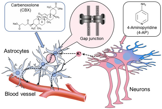 - Onodera, M.; Meyer, J.; Furukawa, K.; Hiraoka, Y.; Aida, T.; Tanaka, K.; Tanaka, K.F.; Rose, C.R.; Matsui, K. Exacerbation of Epilepsy by Astrocyte Alkalization and Gap Junction Uncoupling. J. Neurosci. 2021, 41, 2106–2118. [Google Scholar] [CrossRef] [PubMed]