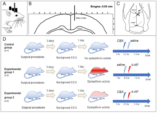 Experiment design: (A). The rat after surgical implantation; (B). The frontal view of the rat brain (modified from [41]); (C). The cannulas (1) and electrodes (2 and 3) location on the rat’s skull. (D). After surgical implantation of the electrodes and the cannula unit, the background ECoG was recorded, and analyzed 3 days later. CDX, the GJ blocker carbenoxolone, 50 mM, 4 µL; 4-AP, 4-aminopyridine, a K- channel inhibitor, 25 mM, 2 µL (for other explanations, see text).