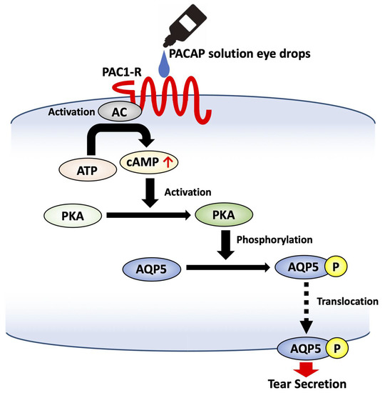 PACAP activates Gs protein signaling via its receptors, such as that involving cAMP production and the phosphorylation of PKA, a cAMP-dependent protein kinase [72]. The level of cAMP in mouse infraorbital lacrimal glands was increased after the administration of PACAP eye drops, and the signal for phosphorylated PKA was also significantly increased. However, pre-treatment with an AC inhibitor suppressed PACAP-induced tear secretion. These results suggest that PACAP-induced tear secretion is mediated by the AC/cAMP/PKA signaling pathway through PAC1-R.