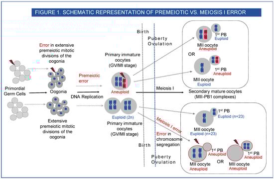 Schematic representation of premeiotic vs. meiosis I error. Human oogenesis begins before birth in the foetus. By the end of the third month of foetal development, the primordial germ cells (PGC) have undergone multiple rounds of mitosis to form oogonia, which undergo premeiotic DNA replication, and the oocytes then enter the prophase I of meiosis I. The oocytes continue through the leptotene, zygotene and pachytene stages of meiotic prophase I. Near the time of birth, all the oocytes have sequentially started the prophase I of meiosis I and are arrested at the diplotene stage. These primary oocytes remain arrested in prophase and are characterised by a nucleus called the germinal vesicle (GV). This stage lasts for many years, and the oocytes do not finish their first meiotic division until after puberty. Premeiotic aneuploidy may arise in the extensive premeiotic mitotic divisions of the oogonia, leading to the gain or loss of chromosome in the primary oocyte at the GV or MI stage (immature oocytes) or mosaic premeiotic aneuploidy may be present in the primordial germ cells, i.e., if a few of the PGCs are aneuploid to start with, they differentiate through mitotic divisions to produce a mix of euploid and aneuploid oogonia. The aneuploid oogonia will then lead to the formation of aneuploid primary oocytes (GV or MI) and on completion of meiosis I, aneuploid secondary metaphase II oocyte—1st PB complexes (MII-PB). At puberty with each monthly cycle, the oocytes sequentially resume meiosis I and proceed through the metaphase I (MI) and anaphase I stages, and the mature gamete is formed after the completion of meiosis I with 23 chromosomes in the metaphase II (MII) oocyte and another 23 chromosomes in the first polar body (1st PB). An error at this stage will lead to aneuploid MII and aneuploid 1st PB (meiosis I error).