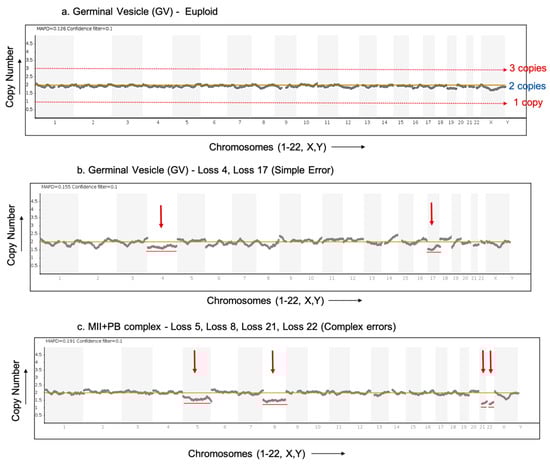 In total, 28 MII+PB complexes were analysed with both the MII oocyte and 1st PB (intact) in a single reaction. Such MII+PB complexes provide information only on premeiotic errors. Of the 28 MII+PB complexes analysed together, six (21.4%) oocyte complexes showed PM errors. Figure 2c shows an aneuploid MII+PB complex with the loss of chromosomes 5, 8, 21 and 22. In Figure 2b,c, certain aneuploidies show non-integer values on the Y-axis (copy number), indicating possible contamination with cumulus cells. In such cases, a copy number variation is seen as a decimal value over a baseline (CN = 2) instead of an integer value. The presence of this contamination tends to mask the true deviation (loss/gain) of the aneuploidy which, in turn, will make the specific gains and losses appear lower (smaller shift) than the expected copy number deviation [].