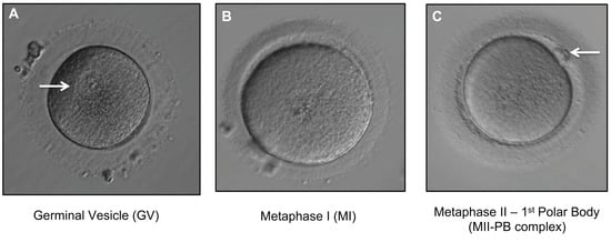 Different stages of oocyte maturation. All oocytes were denuded (removal of the surrounding layer of cumulus cells). (A) Immature GV oocyte. Arrow indicates a germinal vesicle (visible nucleus) with a prominent single nucleolus (400× magnification). (B) Immature MI oocyte showing absence of germinal vesicle and no 1st PB (400× magnification). (C) MII-PB complex (mature MII oocyte with 1st PB). Arrow indicates 1st PB (400× magnification).