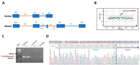 PALB2 Exon 11 duplication testing and breakpoint identification. (A) Schematic representation of the PALB2 normal and mutant alleles, with the duplicated region. The location and orientation of the primers used for specific duplication PCRs are indicated by vertical arrows. (B) PALB2 Exon 11 duplication confirmation by MLPA. (C) Long-range PCR. A specific band of approximately 2.5 kb was detected in the proband’s blood DNA, absent in control samples. (D) Electropherogram showing the breakpoint sequence (forward). Tandem duplication site (TDS) is boxed in orange.
