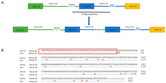 Usually, the genomic consequences of large duplications are difficult to infer without analyzing the RNA or determining the exact breakpoints. Thus, determining the genomic breakpoints of these large genomic rearrangements (LGRs) is essential to interpret their effect on genes and their correlation with phenotypes. In addition, analysis of genomic breakpoints can help characterize the molecular mechanisms behind these rearrangements. Two main mechanisms are involved: homologous (HR) and non-homologous recombination (NHR). The presence of highly homologous sequences in genomic breakpoints generally indicates HR, while the absence of sequence homology indicates a non-homologous mechanism [21]. To date, most of the reported pathogenic PALB2 variants are spliced and nonsense/indel variants. Several pathogenic large duplications have been reported, such as exons 9–11 duplication [22] and exon 13 duplication [23]. Richardson et al. reported PALB2 exon 11 duplication in his study about large duplications in breast cancer predisposition genes using a DNA breakpoint assay based on a custom NGS method. For PALB2 EX11dup, two sets of breakpoints were identified in several families. One family had breakpoints in the AluYa5 and AluY element (5′: intron 10 and 3′: intron 11, respectively), while another proband had both breakpoints upstream of each of those breakpoints in the AluSz and AluSx element, respectively. In accordance with our study, we found the same reported first set of breakpoints (c.3114-811_3202-1756dup) that we have validated at both the DNA and RNA levels in an independent study. As previously reported in other studies that Alu-mediated HR is a frequent mechanism underlying PALB2 large duplications [23,24].