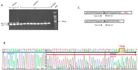 PALB2 Exon 11 duplication disrupts normal splicing and leads to frameshift. (A) Agarose gel electrophoresis of the RT-PCR performed with mRNA obtained from the patient and non-carrier controls. An extra band was observed in the patient of about 474 bp, while only the wild-type band was observed in controls (388 bp). (B) Sanger sequencing of the two alleles of RT-PCR product of the sample from proband: the insertion leads to a new stop codon as indicated by the red box. (C) Schematic representation of the two transcripts observed in the proband sample.