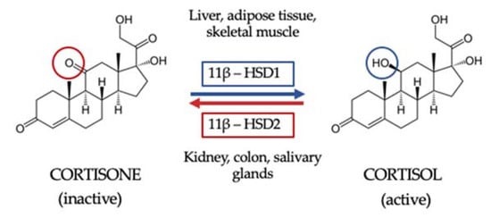 - Morgan, S.A.; McCabe, E.L.; Gathercole, L.L.; Hassan-Smith, Z.K.; Larner, D.P.; Bujalska, I.J.; Stewart, P.M.; Tomlinson, J.W.; Lavery, G.G. 11β-HSD1 is the major regulator of the tissue-specific effects of circulating glucocorticoid excess. Proc. Natl. Acad. Sci. USA 2014, 111, E2482–E2491. [Google Scholar] [CrossRef]